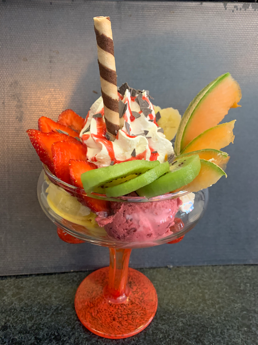 Walking in, the first thing you notice is the colorful display of ice cream on the menu. The shop focuses on classic gelato-style desserts, and everything feels fresh and thoughtfully presented. One of the most popular choices is the Fruchtbecher, a refreshing fruit sundae that balances creamy ice cream with vibrant seasonal fruit. It’s the type of dessert that feels both indulgent and light at the same time.